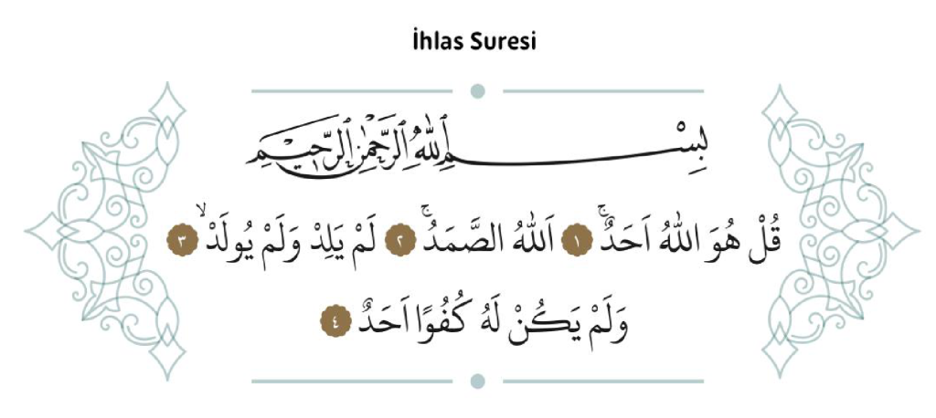 | Bismillâhirraḥmânirraḥîm Ḳul hüvallâhüeḥad Allâhüssamed Lem yelid ve lem yûled Ve lem yeküllehû küfüven eḥad | Rahman ve Rahîm olan Allah’ın adıyla De ki: “O, Allah’tır, tektir.” Allah Samed’dir. (Hiçbir şeye muhtaç olmayandır.) O, doğurmamış ve doğmamıştır. O’nun hiçbir dengi (eşi, benzeri) yoktur. |